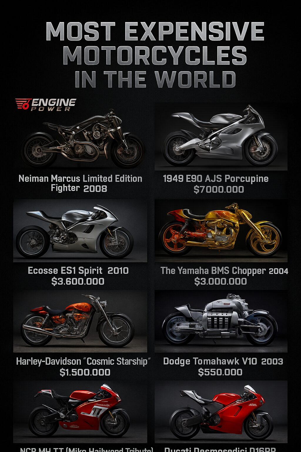 • Η μοτοσικλέτα «Neiman Marcus Limited Edition Fighter», που παρουσιάστηκε ως υπερ-περιορισμένη έκδοση, έφτασε τιμή $11 εκατομμυρίων περίπου.