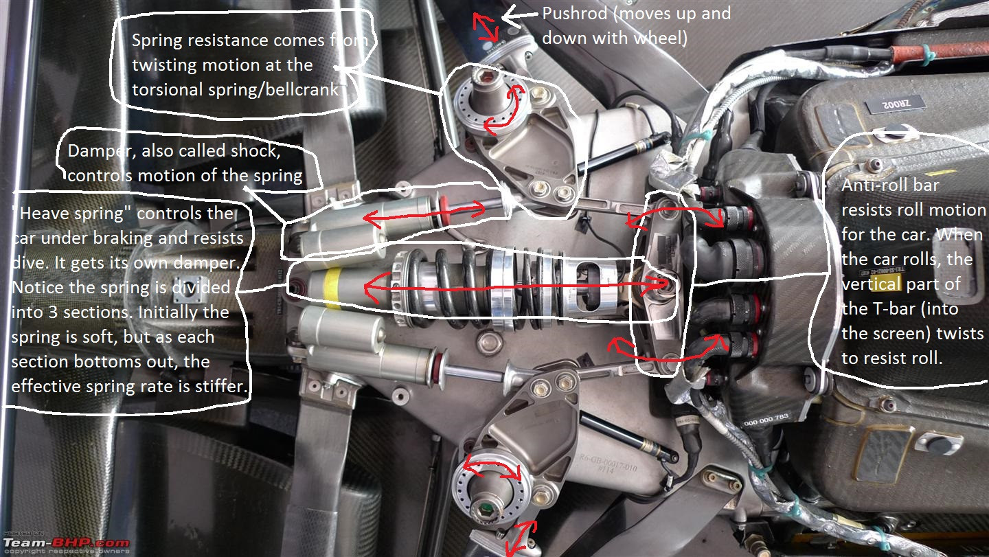 Όταν το μονοθέσιο φρενάρει, επιταχύνει ή περνάει κορυφές στην πίστα, οι δύο πλευρές της ανάρτησης συμπιέζονται ταυτόχρονα. Εκεί το heave spring αντιδρά σαν “κεντρικός σταθεροποιητής”.
