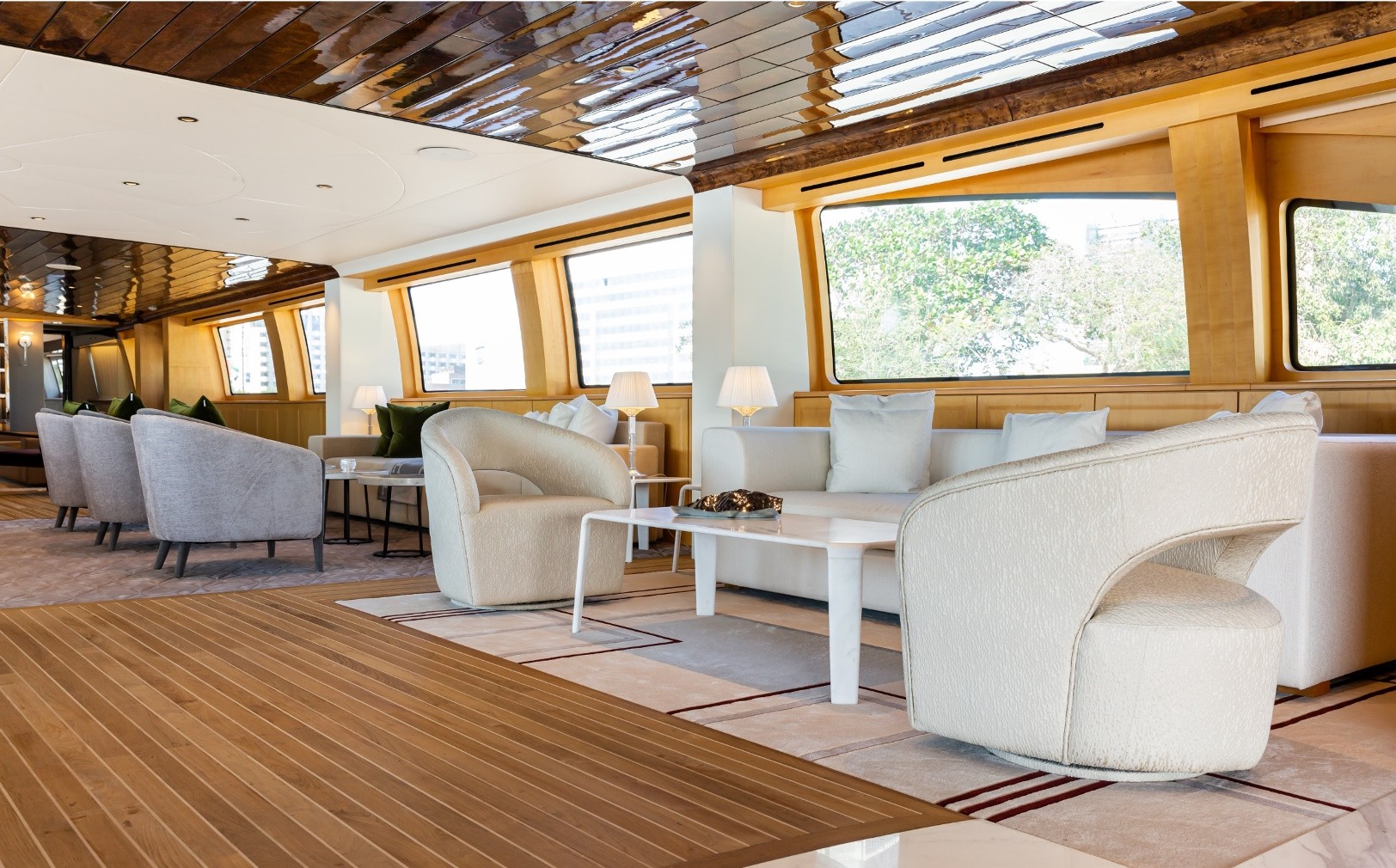 Υπάρχει ιδιωτικός κινηματογράφος, δύο σκάλες και μια φαρδιά πλατφόρμα κολύμβησης που διπλώνει μέχρι το επίπεδο της θάλασσας – ιδανική για πρωινές βουτιές ή ποτά στο ηλιοβασίλεμα.  Οι δύο πετρελαιοκινητήρες Caterpillar των 1.678 ίππων το ανεβάζουν στους 18 κόμβους, απόδειξη ότι τα παραδοσιακά υλικά δεν σημαίνουν αργή απόδοση. Είναι μια παραδοσιακή χειροτεχνία προσαρμοσμένη στις σύγχρονες προσδοκίες, με κάθε επιφάνεια φινιρισμένη στο χέρι, κάθε λεπτομέρεια προσεγμένη.